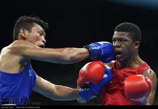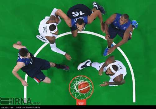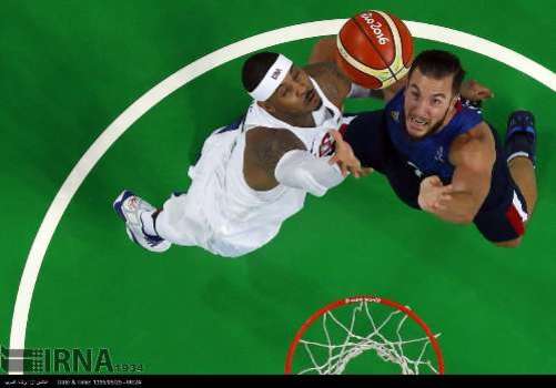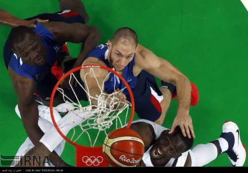 تصویر «چارلز کاهودی» و «کیم تیلی» از تیم فرانسه را در رقابت با «درایموند گرین» امریکایی در مسابقات بسکتبال المپیک 2016 ریودوژانیرو نشان می دهد.