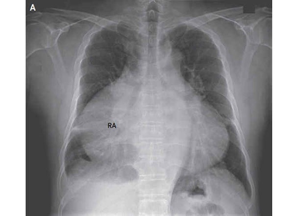 به دليل بزرگشدن دهليز، نسبت قلبي سينهاي اين مرد به 0.82 رسيدهبود. اين نسبت براساس پهناي قلب در برابر پهناي قفسه سينه به دست ميآيد. به بياني ديگر قلب اين مرد 82 درصد از فضاي عرضي درون قفسه سينه او را اشغال كردهاست. نسبت عادي قلب به قفسه سينه بايد 0.5 باشد، يعني قلب بايد كمتر از 50 درصد از عرض فضاي درون قفسه سينه انسان را اشغال كند.