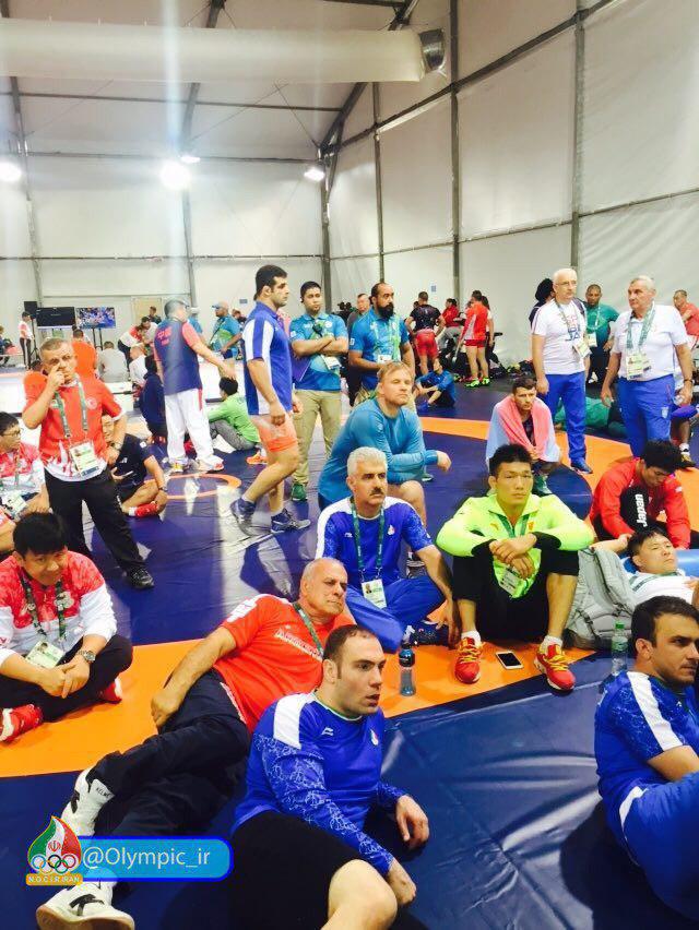 به گزارش تسنیم، کادر فنی تیم کشتی فرنگی کشورمان به هنگام آغاز مسابقات کشتی امروز از دو مانیتور در حال تماشای این مسابقات بودند. همچنین حبیب اخلاقی، سعید عبدولی، قاسم رضایی، امید نوروزی و بشیر بابازاده نیز در سالنی که اعضای کشتی در آن حضور داشتند، نظارهگر مسابقات بودند. تنها حمید سوریان در دهکده بازیها باقی ماند تا به استراحت بپردازد.