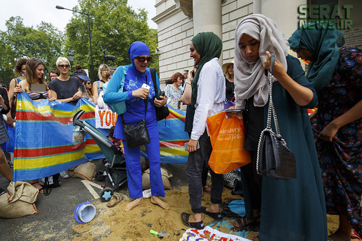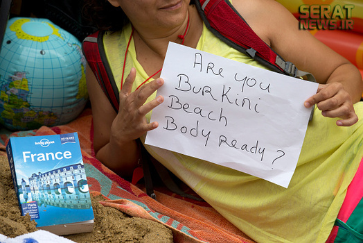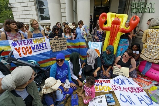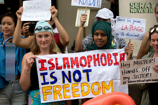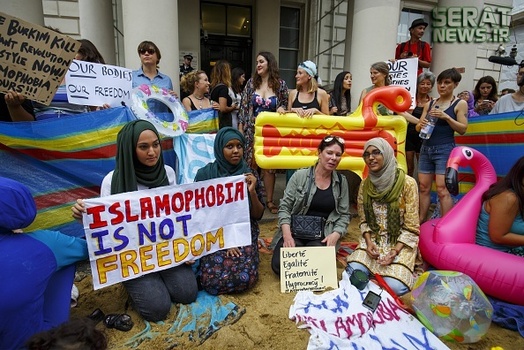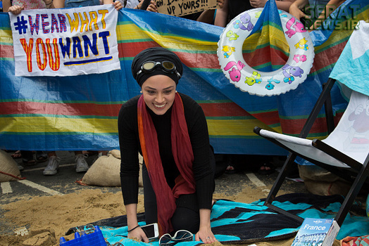 گروهی از زنان مسلمان و غیر مسلمان  در اعتراض به ممنوعیت لباس شنای اسلامی در فرانسه مقابل سفارت این کشور در لندن پایتخت انگلیس تجمع کردند. این زنان با لباسهای شنای اسلامی و غیر اسلامی در این تجمع شرکت داشتند.برخی از شرکت کنندگان با خود پوسترهایی حمل میکردند که روی آن نوشته بود "اسلام هراسی آزادی نیست" و اجازه دهید چیزی را که آنها خودشان میخواهند بپوشند." البته دادگاه فرانسه اخیرا این ممنوعیت را لغو کرده و اعمال محدودیت از سوی شهرداران شهرهاس ساحلی را ممنوع اعلام کرده است.
