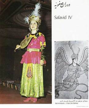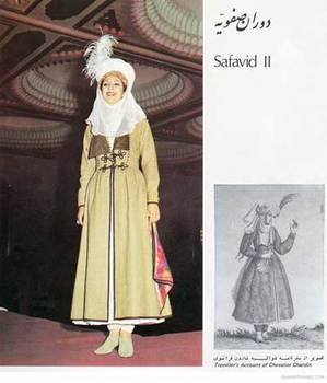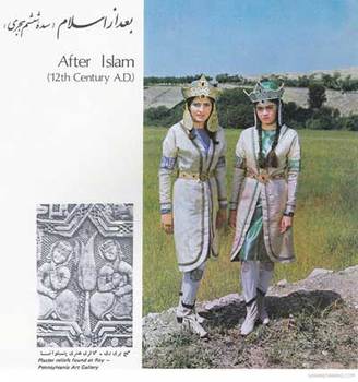 به این معنی که پوشش زنان ایرانی در دوره های مختلف از روی حجاری ها، حکاکی ها، مجسمه ها و سفالینه های به جا مانده از ادوار مختلف ایران کپی برداری و بازسازی شده است.