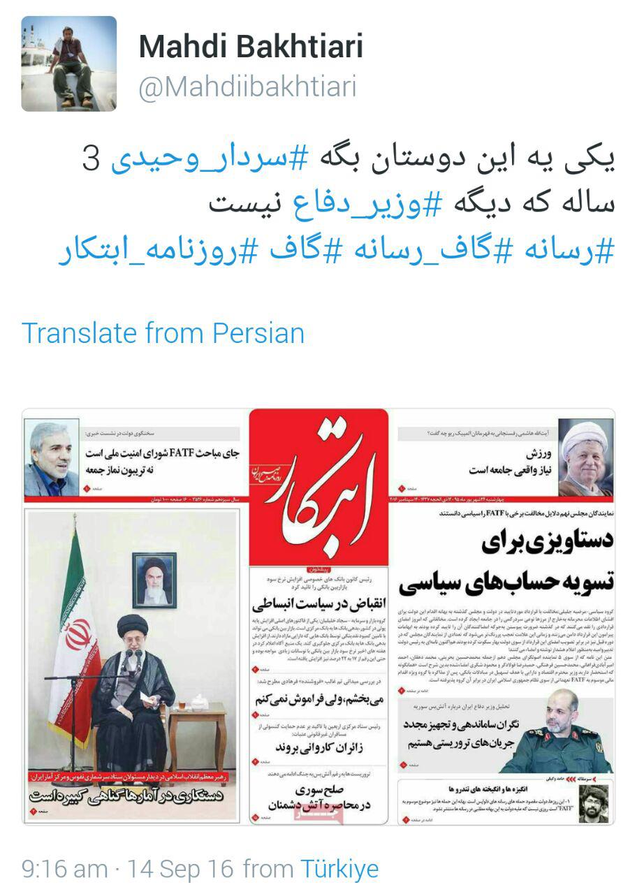 روزنامه ابتکار سردار وحیدی را وزیر دفاع نامید!