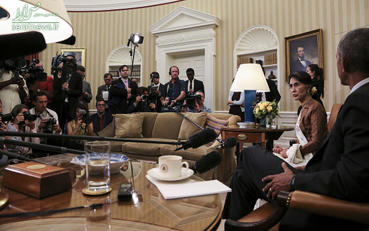 "آنگ سان سوچی" مشاور دولت میانمار که عملا رهبری این کشور جنوب شرق آسیا را بر عهده دارد با "باراک اوباما" رئیس جمهور آمریکا در کاخ سفید دیدار کرد. اوباما در این دیدار متعهد به لغو تحریمهای میانمار شد و گفت آمریکا در حال حاضر آماده لغو تحریمهایی است که به میانمار تحمیل شده است و این اقدام به زودی انجام خواهد شد.