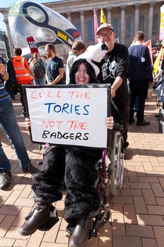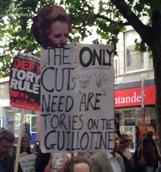 در این تظاهرات شرکت کنندهها پلاکاردهایی در دست داشتند که روی آن نوشته شده بود: تنها کاهشی که به آن نیاز داریم حزب محافظه کار و گیوتین است. برخی نیز دیوار امنیتی محافظ اعضای پارلمان حزب محافظهکار را به برنامه دونالد ترامپ برای ساخت دیوار در مرز مکزیک مقایسه کردند و تعدادی نیز دیوید کامرون، نخستوزیر سابق بریتانیا را تروریست مالی و فاشیست نامیدند.