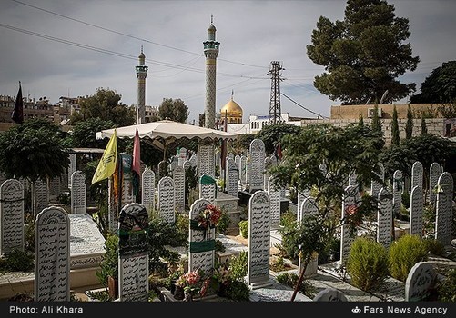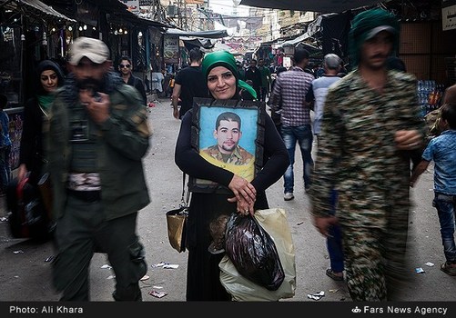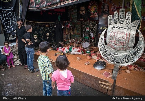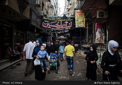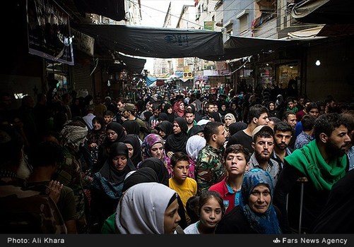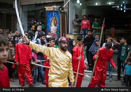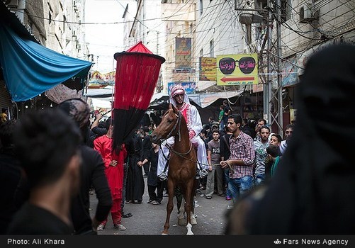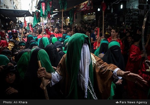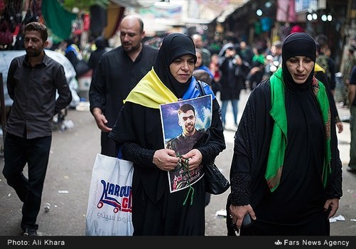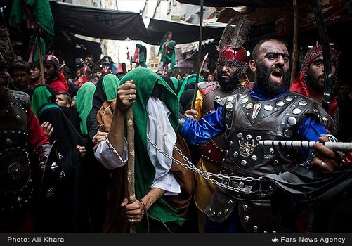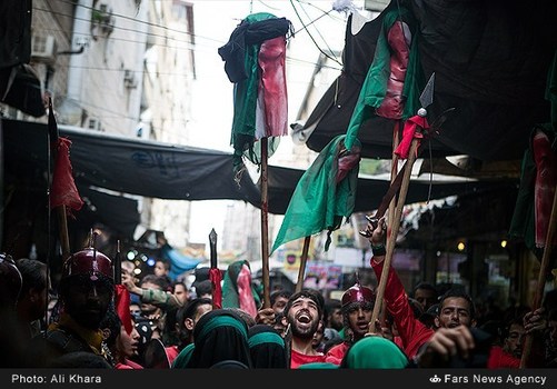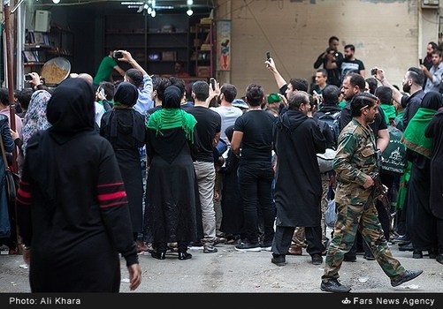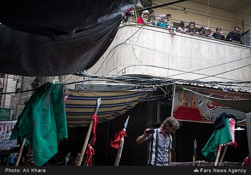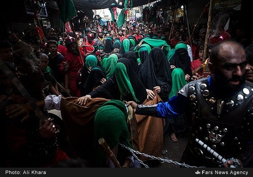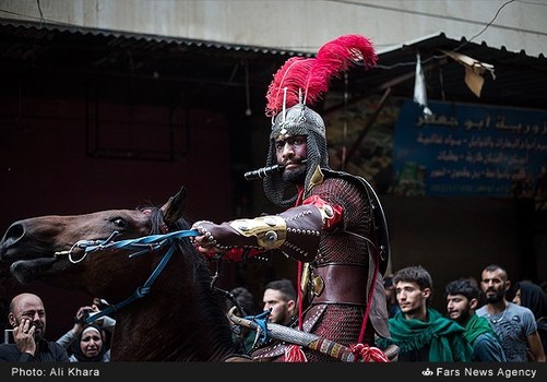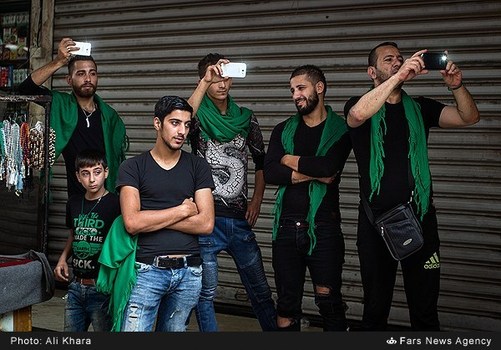 همزمان با ظهر عاشورا دسته های عزاداری در زینبیه دمشق درحال حرکت به سمت حرم حضرت زینب(س) هستند و برخی دسته جات در این بین به بازسازی صحنه کاروان اسرای اهل بیت(ع) در شام می پردازند. به دلایل امنیتی ورود هیئات به حرم ممنوع بوده و عزاداران در مقابل درب ورودی به سینه زنی و مرثیه سرایی می پردازند.