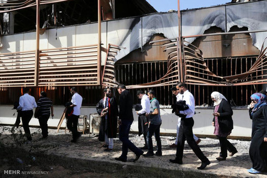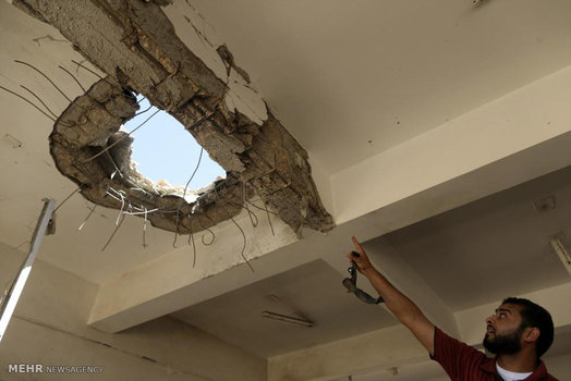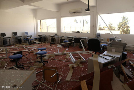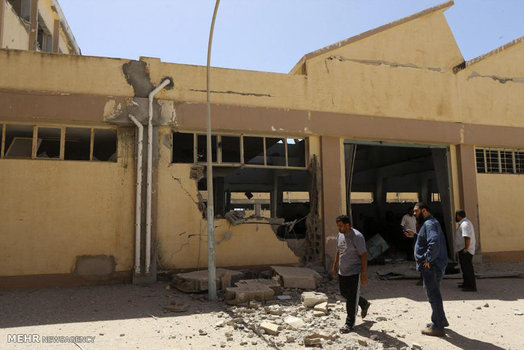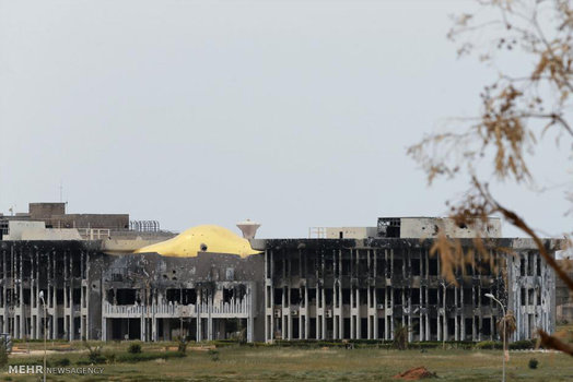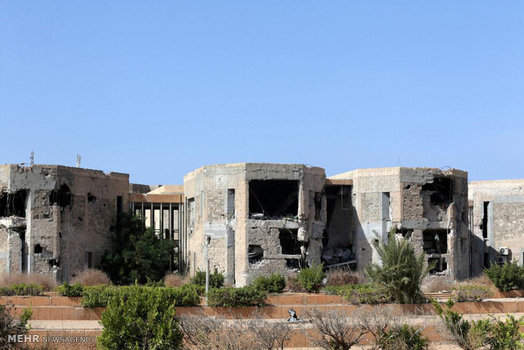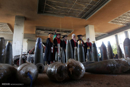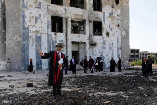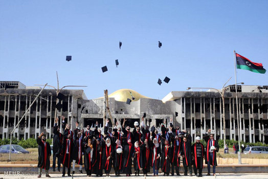 دانشجویان لیبیایی که به تازگی از دانشگاه شهر جنگ زده بنغازی فارغ التحصیل شده اند، پایان دوران تحصیل خود را در محل ساختمان اداری این دانشگاه که در جریان درگیری های ۲ سال اخیر تخریب شده جشن گرفتند.