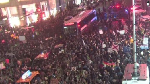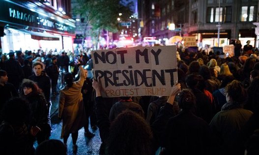 در حال حاضر بین پنج تا ده هزار نفر در مرکز منهتن تجمع و علیه انتخاب دونالد ترامپ به عنوان رئیس جمهور تظاهرات کردند؛ معترضان شعارهایی مانند «دونالد ترامپ باید برود» و «دونالد ترامپ رئیس جمهور من نیست» سر می دهند.