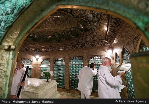 همچنین آیات عظام و حججاسلام علم الهدی، رئیسی، مروارید، رسولی محلاتی و علی واعظ طبسی در این مراسم حضور داشتند و علاوه بر غبارروبی مشبکها و فضای داخل ضریح منور، سنگ مضجع حضرت ثامنالحجج (ع) با گلاب ناب شستوشو داده شد.