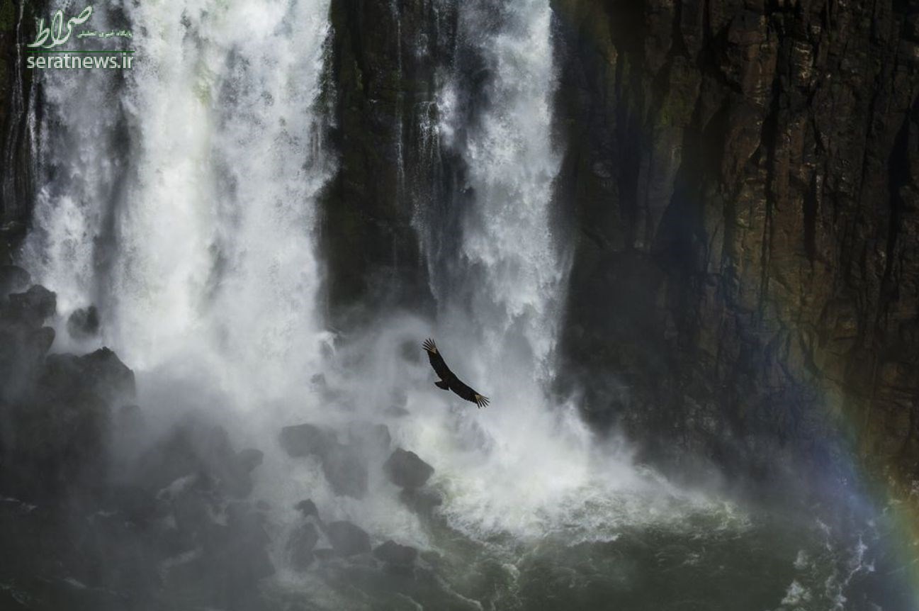پرواز یک کرکس سیاه مقابل آبشار ایگواسو همزمان با ایجاد رنگین کمان صحنه جالب و دیدنی خلق کرده است. آبشار ایگواسو، آبشاری نعلی شکل است که بدر مرز آرژانتین با برزیل قرار دارد. شیرجه 269 فوتی این پرنده یکی از زیبا ترین مناظر را به وجود می آورد.