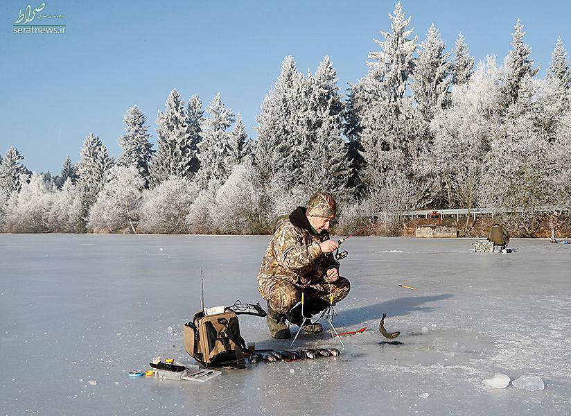 صیادان ماهی در منطقه موراویا از یک برکه یخ زده ماهی قزل آلا صید می کنند.