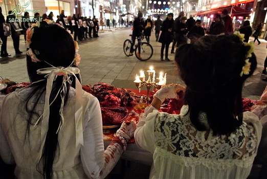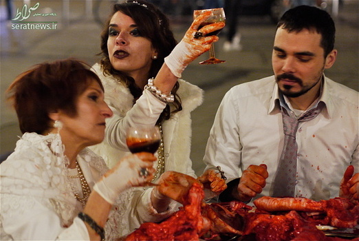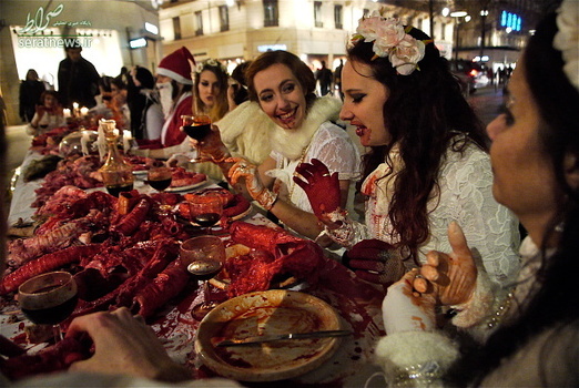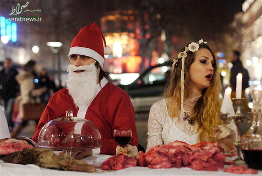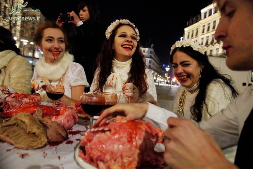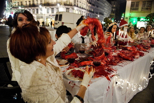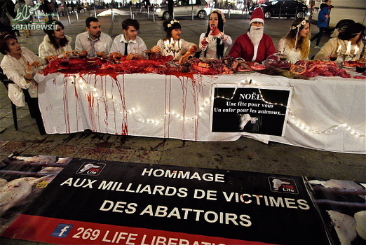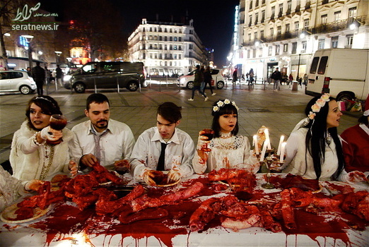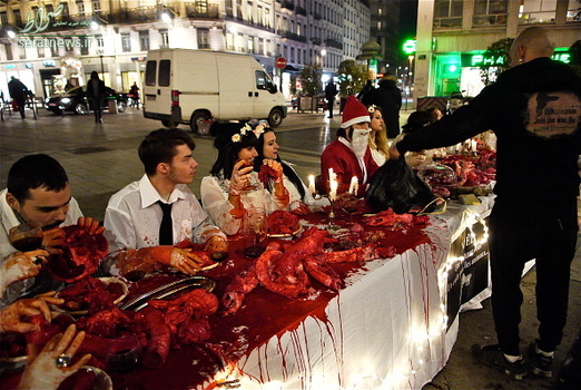 یک گروه از فعالان دفاع از حقوق حیوانات در شهر لیون فرانسه در اقدامی نمادین شام خونین کریسمس را خوردند. این افراد با قرار دادن یک میز شام در گوشهای از خیابان لیون و پوشیدن لباس های سفید یک میهمانی ترتیب داده و خون و اعضای بدن حیوانات را در اقدامی نمادین خوردند. این کار به منظور جلب توجه مردم به دفاع از حقوق حیوانات صورت گرفت.