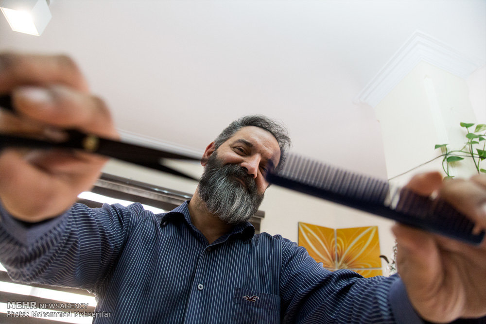 هرچه درباره اصلاح موی سر و شگردهایش میپرسیم توضیح کوتاهی میدهد و وارد اصلاح ریش میشود. آنقدر درباره اصلاح ریش و قلقهایش توضیح میدهد که دسته آخر آب پاکی را روی دستمان میریزد و میگوید:«شاید شما بگویید من فلان آهنگ یا فلان نوحه را گوش بدهم حالم خوب میشود. من دراصلاح ریش اینطوری هستم. نمیگویم کار و طراحی خاصی انجام میدهم. اما کلا روی ریش خیلی کار میکنم و بیشتر لذت میبرم. من عاشق ریش درست کردن هستم. وقتی دوتا قیچی میزنم و میبینم چهره مشتری از این رو به آن رو میشود حسابی سر ذوق میآیم. یک بنده خدایی زنگ زد و گفت می خواهم بیایم موهایم را اصلاح کنی. گفتم تا الان کجا میرفتی؟ سرت را برو همانجا کوتاه کن که رابطهات با دوستت به هم نخورد اما ریش خودت را بیاور اینجا خودم برایت درست میکنم.»