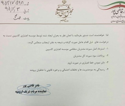 نادر قاضی‌پور نماینده مجلس در نامه‌ ای به ولی‌الله سیف رئیس کل بانک مرکزی خواستار پرداخت اصل و سود سپرده سپرده‌گذاران کاسپین و رسیدگی به آخرین وضعیت کارمندان ثامن‌الحجج شد.