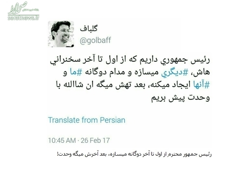 صراط: برخی از کاربران عنوان کردند شاید پیگیر وعدههای انتخاباتی روحانی نباشند اما آلزایمر ندارند و آن وعدهها را فراموش کردند، برخی دیگر هم نوشتند رئیسجمهوری که دائم حرف از «ما» و «آنها» میزند چگونه میتواند شعار «وحدت» سر دهد!