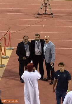 * علیرضا منصوریان قبل از شروع مسابقه در زمین حاضر شد و با استقبال مسئولان برگزاری مسابقه، در کنار آنها عکس یادگاری گرفت.