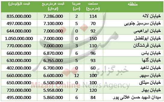 جدول/ مظنه آپارتمان در منطقه مرزداران