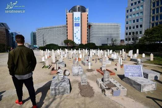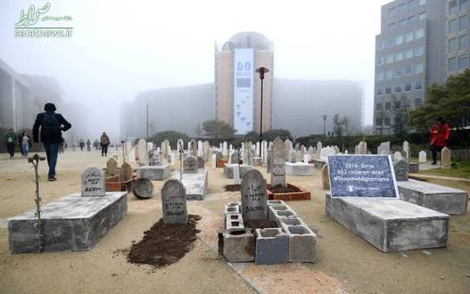 یک سازمان غیر دولتی در اقدامی نمادین با قرار دادن چند قبر ساختگی مقابل شورای وزیران اروپا در بروکسل به جنگ شش ساله در سوریه و کشته شدن کودکان اعتراض کردند.