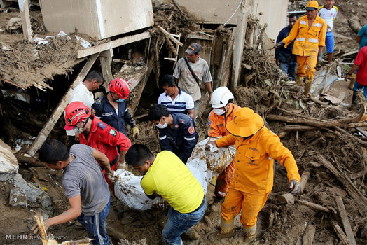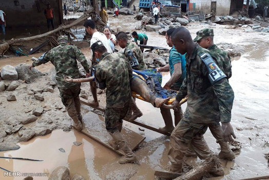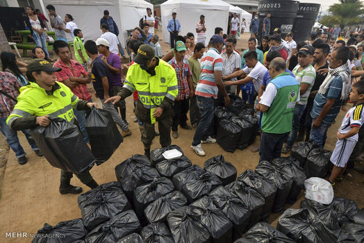 نیروهای پلیس کلمبیا در منطقه موکوئا بین سیل زدگان مواد غذایی توزیع می کنند. تاکنون بیش از ۲۵۰ نفر از جمله ۴۳ کودک در اثر سیل و رانش زمین کشته شده اند .