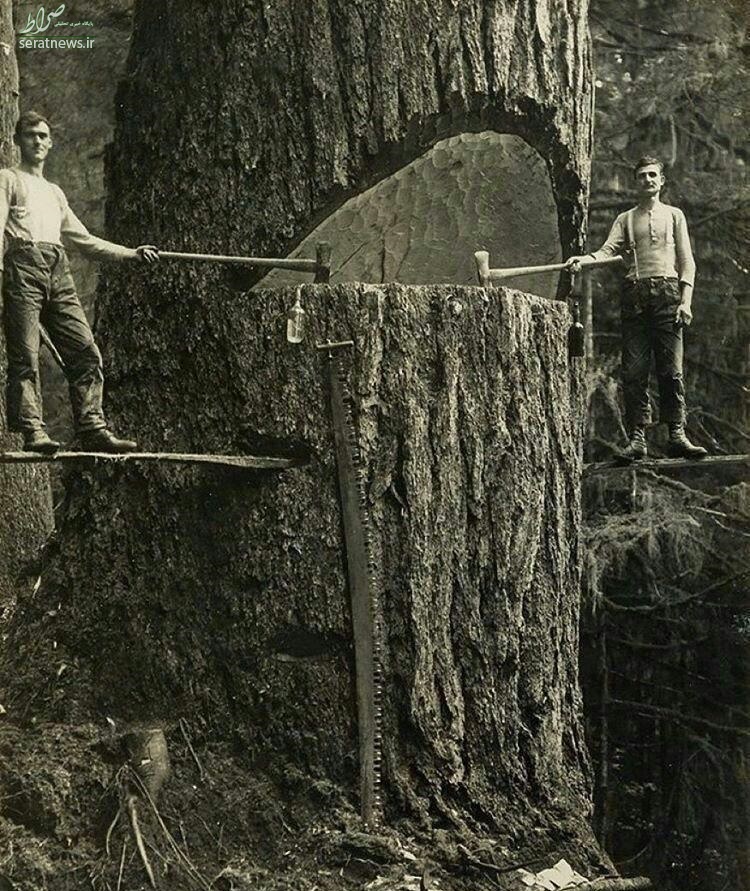 تصویری جالب از دو تبر زن در حال قطع یک درخت بسیار غول پیکر | سال ۱۹۱۵