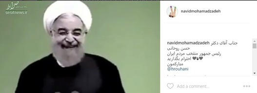 نوید محمدزاده: «جناب آقاى دكتر حسن روحانى، رئيس جمهور منتخب مردم ايران، احترام بگذاريد. مباركمون.»