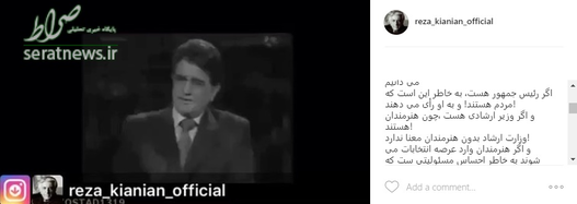 رضا کیانیان: «هموطنان عزيزِ خارج و داخل كشور، تبريك براى گام بزرگى كه برداشتيم. تبريك براى گذر از دودلى ها و بى تفاوتى ها... تبريك براى درك مان از شرايط امروز. تبريك براى پشت كردن به پوپوليسم. به قول بزرگى، حوادث تاريخى بار اول شكل تراژيك دارند، ولى بار دوم به كمدى تبديل خواهند شد. مثل پوپوليسم!