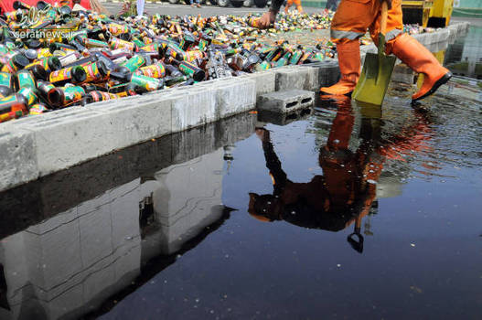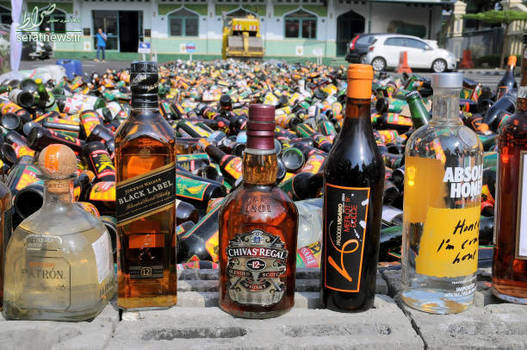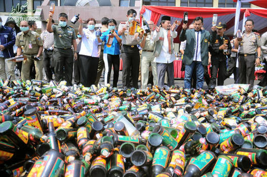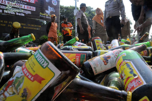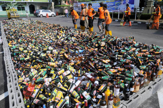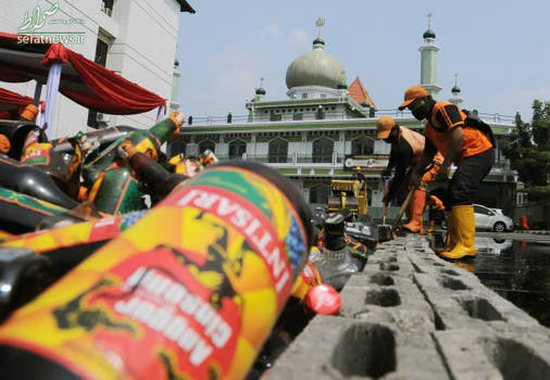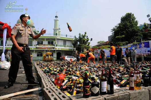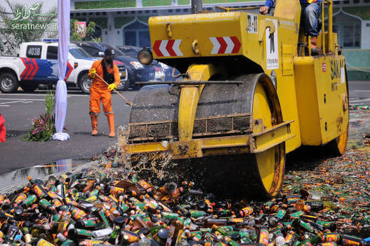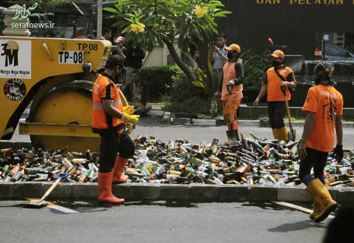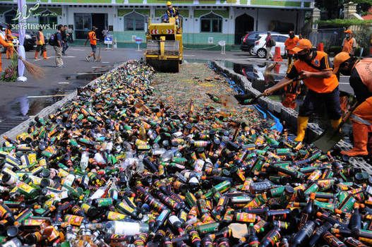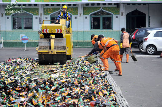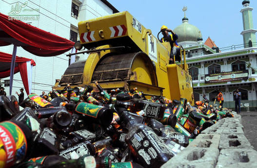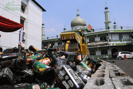 در آستانه ماه مبارک رمضان مقامات پلیس اندونزی دهها هزار شیشه مشروبات الکلی کشف شده از فروشندگان را مقابل مسجدی در این کشور به وسیله غلتتک منهدم کردند.