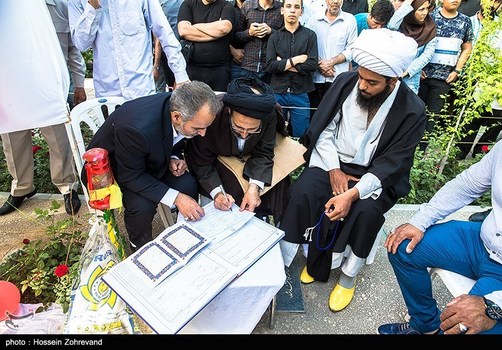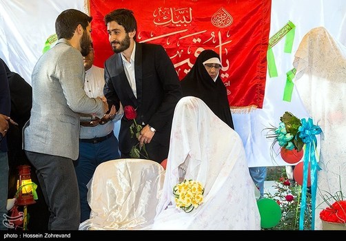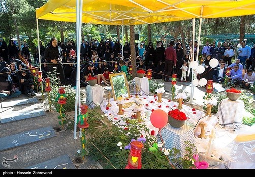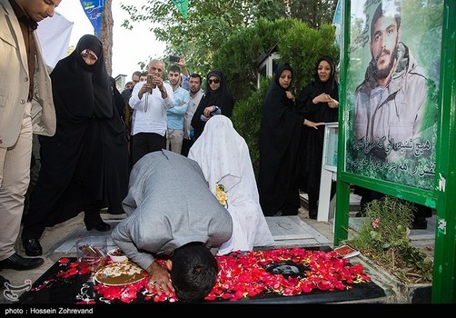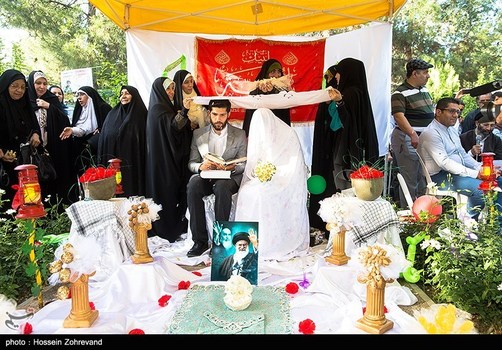 عصر امروز دو زوج جوان مراسم جشن عقد خود را در قطعه ۴۰ بهشت زهرا تهران برگزار کردند.بانی آشنایی یکی از زوج ها خواهر شهید جاوید الاثر ابراهیم هادی و خانواده شهید مدافع حرم جواد الله کرم بودند.