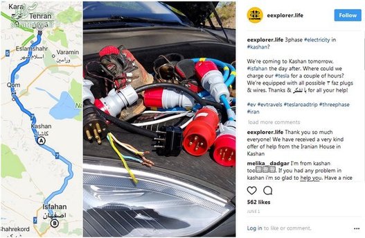 تسلا، ماگدالنا و بندیکت تا حالا ۱۰ هزار کیلومتر راه آمده‌اند و نزدیک به ۲ مگاوات برق مصرف کرده‌اند. یکی از انگیزه‌های سفر این زوج سوئیسی آن بود که اثبات کنند قرار نیست هنگام سفر با خودروی برقی در جایی بمانند، چون این دستگاه براحتی قابل شارژ است، حتی در پارکینگ خانه با اتصال به پریز برق. آن‌ها تصاویری از جایگاه‌های شارژ این خودرو در ایران را منتشر کرده‌اند تا خیال دغدغه‌مندها را از این بابت آسوده کنند.