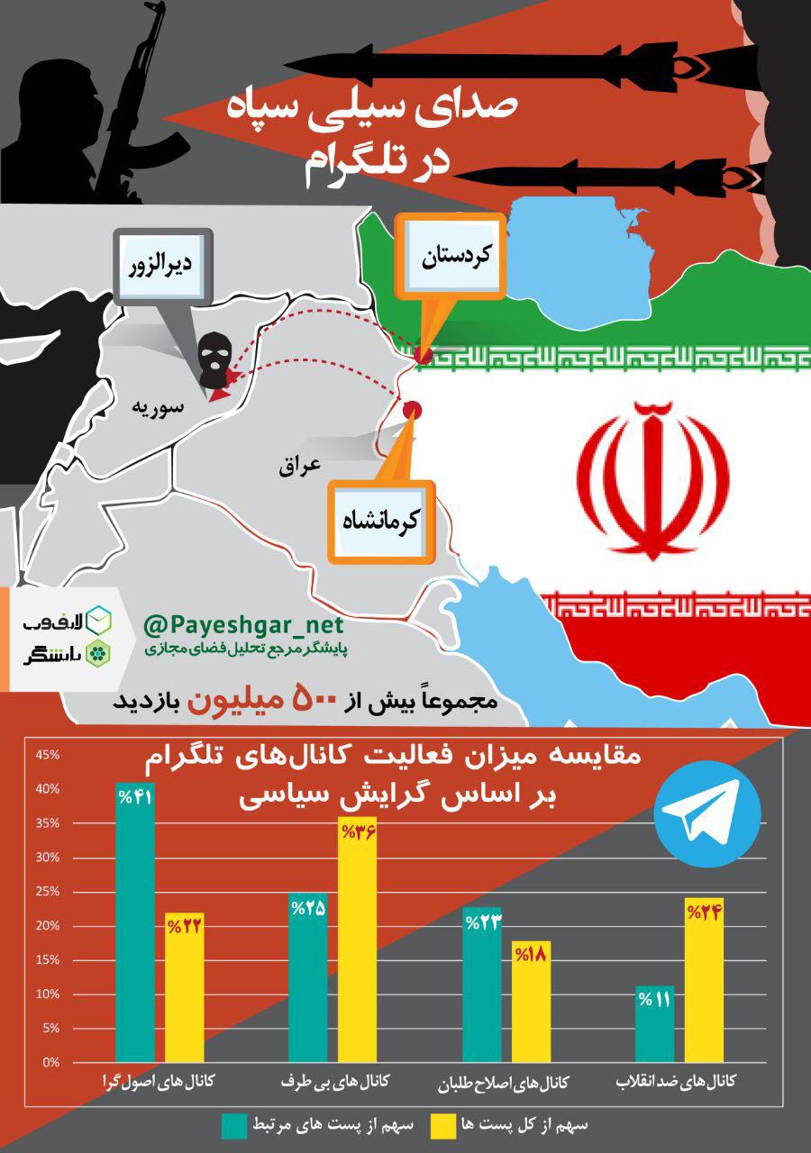 به گزارش باشگاه خبرنگاران جوان؛ یکشنبه شب گذشته پس از اقدام تلافی‌جویانه و تحسین‌برانگیز سپاه پاسداران در حمله به مقر تروریست‌های داعش، شبکه‌های اجتماعی پر شد از سیل پیام‌ها و کامنت‌هایی که از سوی کاربران عادی و سیاسی به اشتراک گذاشته می‌شد؛ در این بین مقامات و افراد فعال در جناح‌های سیاسی نیز نقش عمده‌ای ایفا کردند. اینفوگرافی زیر میزان مشارکت دو جناح اصلاح‌طلب و اصولگرا و همچنین کانال‌های ضد انقلاب را نشان می‌دهد. حدود 41% از پیام‌های مربوط به حمله موشکی سپاه به فعالان اصولگرا، 23% به جناح اصلاح‌طلب، 25% بی‌طرف و 11% به کانال‌های ضد انقلاب اختصاص داشت. در مجموع حدود 500 میلیون بازدید در این مدت در کانال‌های تلگرامی صورت گرفت.