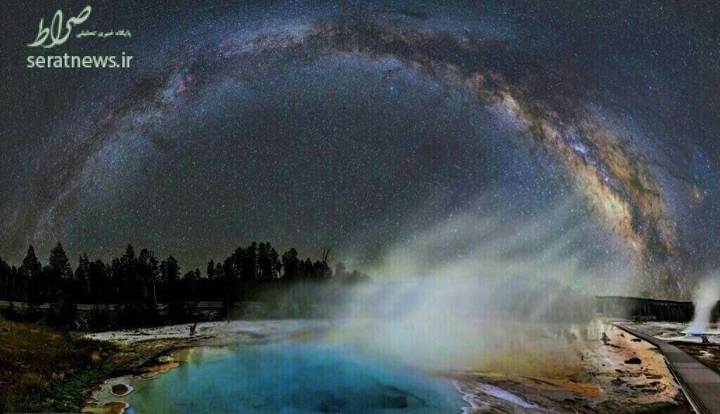 تصویر خیره کننده از کهکشان راه شیری بر فراز چشمه بزرگ آبگرم "منشوری" واقع در پارک ملی "یلوستون"