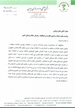 «با توجه به تصمیم هیات محترم اجرایی انتخابات نظام پزشکی کشور در برگزاری غیر حضوری و اینترنتی انتخابات و به دلیل تعطیلی ایام پایانی هفته اکثریت همکاران با اطمینان خاطر از امکان مشارکت به روش غیر حضوری در خارج از حوزههای انتخاباتی خود و یا مشغول به خدمت رسانی در بخشهای دولتی و خصوصی که از قبل تنظیم گردیده و امکان لغو آن نبوده است به سر میبردهاند و از زمان شروع انتخابات در روز جمعه سیام تیر ماه تا ساعات چهارده همان روز به دلیل ایرادات فنی امکان مشارکت غیر حضوری همکاران میسر نگردید و کمال تاسف حیرت به یکباره خبر لغو امکان مشارکت اینترنتی توسط هیات محترم اجرایی صادر شد در نتیجه سبب تضییع حقوق بسیاری از همکاران و کاهش شدید مشارکت در انتخابات گردید.