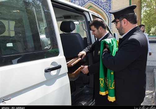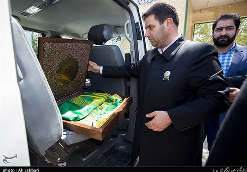 خادمان حرم امام رضا (ع) با پرچم متبرک به آستان این حضرت پیکر بنیتا را در این مراسم بدرقه کردند.