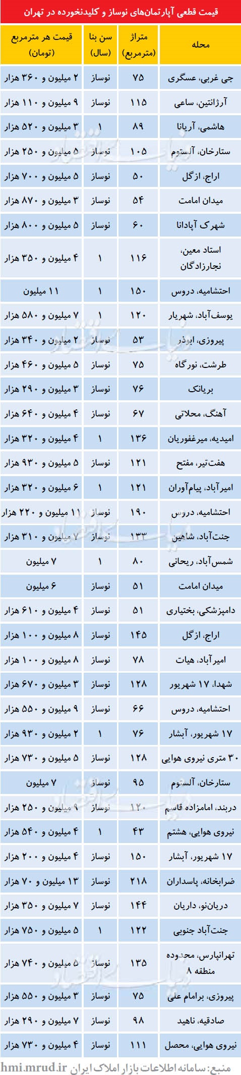 جدول/ قیمت آپارتمان کلیدنخورده در نقاط مختلف تهران