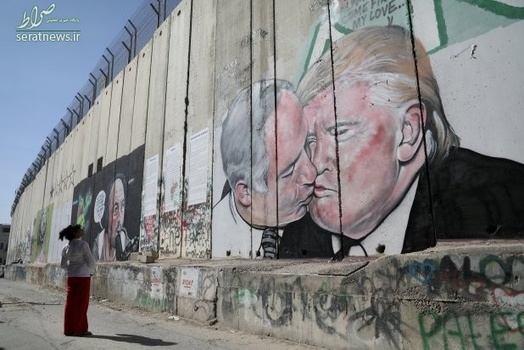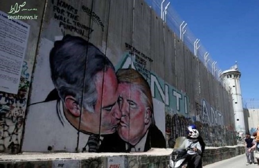 صراط: یک طراح گرافیتی استرالیایی، با کشیدن طرح تمسخرآمیز دونالد ترامپ رئیس جمهور آمریکا و بنیامین نتانیاهو، نخست وزیر اسرائیل بر روی دیوار، روابط مستحکم و گرم آنها را مورد انتقاد قرار داده است. این تصویر روی دیوار حایل در اطراف شهر بیت لحم در کرانه باختری کشیده شده است و ترامپ و نتانیاهو را در حال بوسیدن هم نشان میدهد.