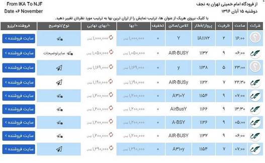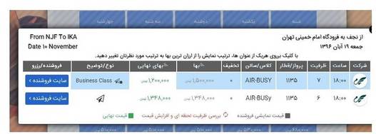 به گزارش تسنیم با این وجود، سایتهای فروش بلیت پروازهای مذکور، پروازها به مقاصد نجف و بغداد را با قیمتهای سرسامآور به فروش میرسانند. در جدیدترین نمونه قیمت پرواز رفت تهران-نجف به یک میلیون و 290 هزار تومان و پرواز برگشت به یک میلیون و 348 هزار تومان افزایش یافته است. به عبارت دیگر قیمت پرواز رفت و برگشت این مسیر حدود دو میلیون و 650 هزار تومان است. این در حالی است که نرخ مصوب پرواز تهران-نجف-تهران یک میلیون و 200 هزار تومان تعیین شده است.