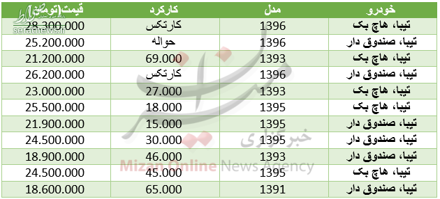 برای خرید خودرو تیبا در بازار باید حداقل 18 میلیون تومان هزینه کرد. قیمت مدل‌های مختلف خودرو تیبا در بازار به شرح زیر است.