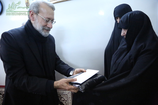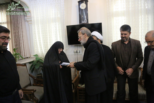 دیدار علی لاریجانی رییس مجلس شورای اسلامی و نماینده مردم قم ، سیدمهدی صادقی استاندارقم و سردار سيد جواد هاشمي مدیرکل بنیاد شهید و امور ایثارگران استان از خانواده شهید تقوی شهید ترور مجلس و شهیدان طاهری شهيد دفاع مقدس و شهید سامانلو شهید مدافع حرم/ عكاس: محمود وكيلي- صراط نيوز