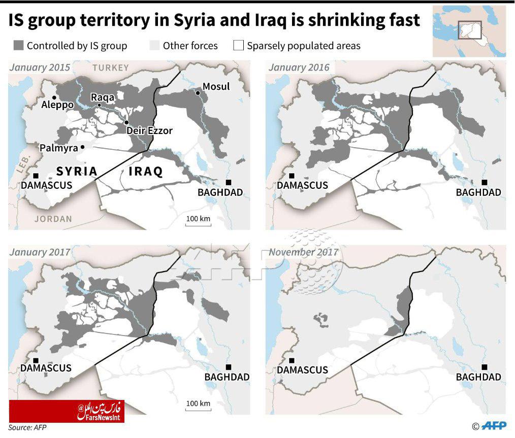 مناطق تحت تصرف داعش (سیاه رنگ) در عراق و سوریه در فاصله ژانویه ۲۰۱۵ تا نوامبر ۲۰۱۷