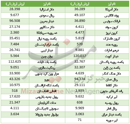 ارزش 39 ارز بین بانکی در حالی از سوی بانک مرکزی اعلام شد که ارزش 19 ارز روند صعودی، ارزش 19 ارز همچون پوند، یورو روند نزولی و ارزش یک ارز همچون لیر سوریه بدون تغییر قیمت به کار خود ادامه می دهد. ارزش دلار آمریکا در حالی رشد کرده که ارزش دو ارز دیگر پرمصرف بازار همچون پوند و یورو روند نزولی به خود گرفته است.