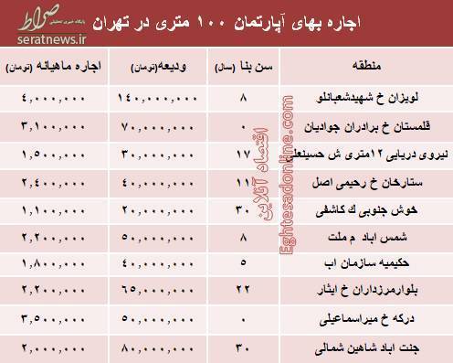 جدول/ اجارهبهای آپارتمان ۱۰۰ متری در تهران