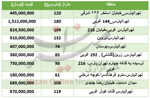 برای خرید یک واحد آپارتمان در شرق تهران با توجه به متراژ، عمر بنا و محدوده دقیق آپارتمان حداقل از مبلغ ۱۸۰ میلیون تومان به بالا باید هزینه کنید. قیمت برخی از واحدها در محدوده تهرانپارس به شرح زیر است: