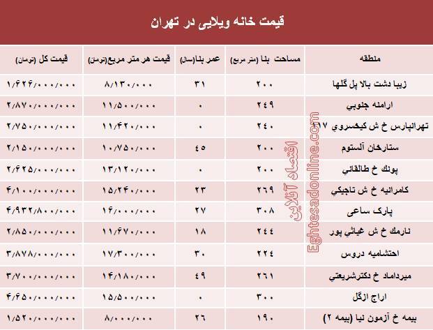 جدول/ قیمت خانههای ویلایی تهران