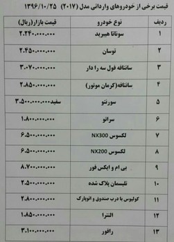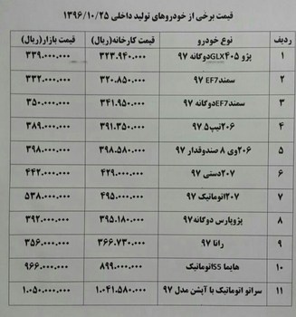 جزئیات قیمت انواع خودروهای داخلی و وارداتی به شرح زیر است:
