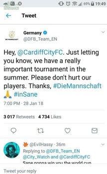 این تکل خشن که مستعد شکست استخوان مهاجم آلمانی منسیتی بود او را حداقل دو هفته خانهنشین میکند، ژرمنها را از بابت از دست دادن بازیکن بااستعدادشان در جام جهانی سال آینده در روسیه به شدت نگران کرده تا حدی که آنها در توئیتر فدراسیون فوتبال آلمانی پیامی خطاب به باشگاه کاردیف گذاشتهاند و به این باشگاه در خصوص آسیب رساندن به بازیکنان آلمانی فوتبال انگلیس تذکر دادهاند.