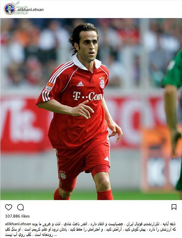 احسان علیخانی با انتشار پستی در اینستاگرامش برای حمایت از علی کریمی بعد از صحبت هایش در برنامه نود نوشت: یادتان نرود او علی کریمی است ، او سنگِ کفِ رودخانه است ، کَفِ روی آب نیست.