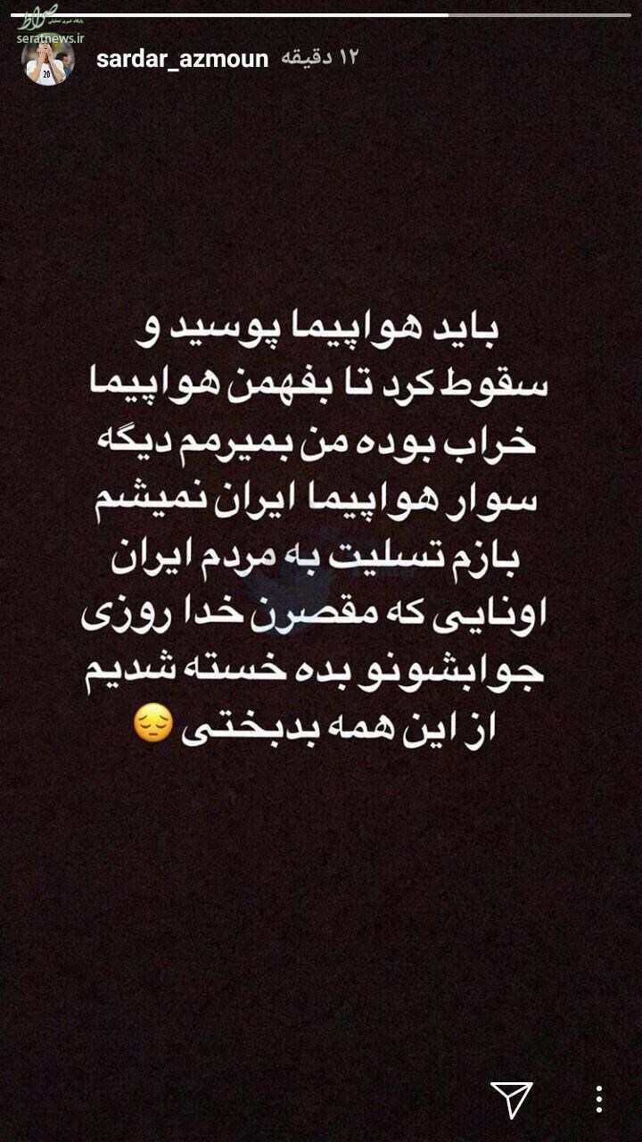 صبح امروز هواپیمای ATR72 شرکت آسمان دچار سانحه شد و سقوط کرد . سردار آزمون مهاجم تیم ملی فوتبال ایران به سانحه هوایی صبح امروز در استوری اینستاگرام خود واکنش نشان داد.