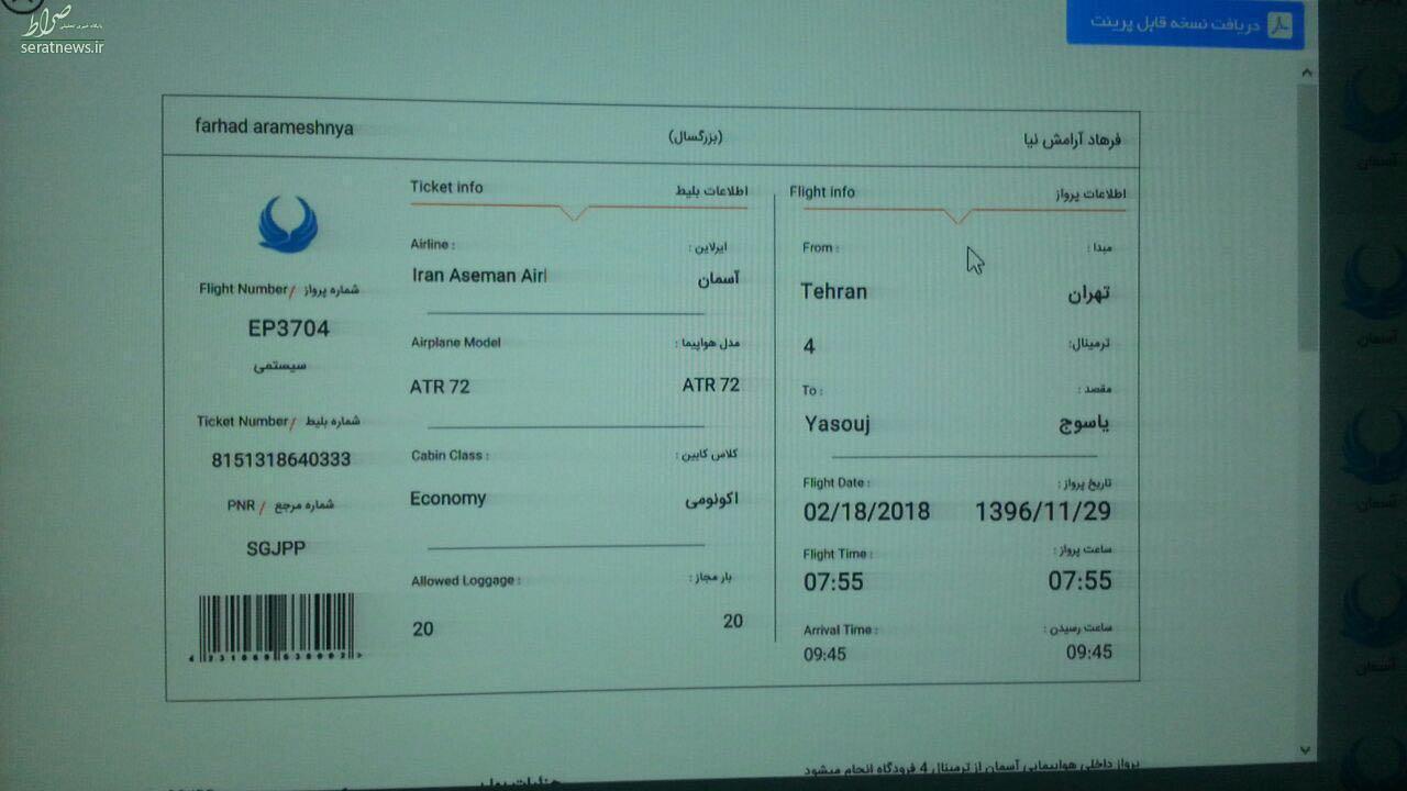 عکس/بليت مسافر جامانده از پرواز امروز ياسوج
