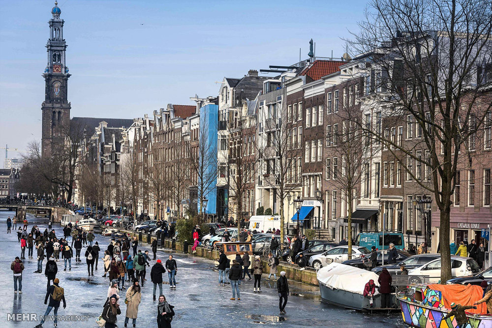 به دنبال سرمای شدید هوا در هلند کانال های آب عبوری از وسط شهر آمستردام یخ زده و فرصتی را برای شهروندان جهت اسکیت بازی فراهم کرده است.