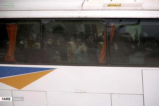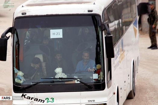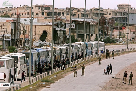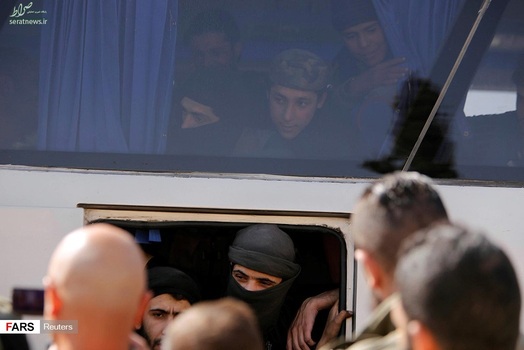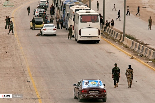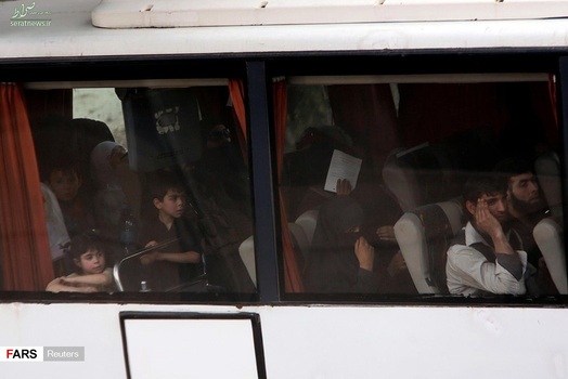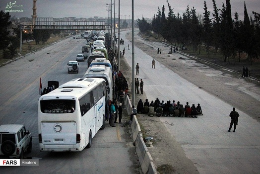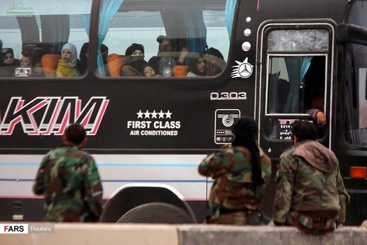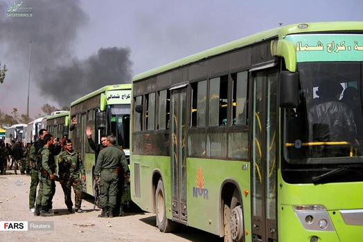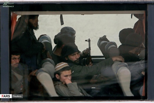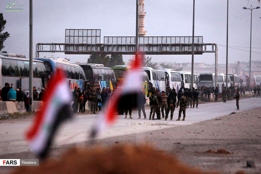 با تسلیم صدها نظامی تروریست و موافقت حکومت بشار اسد، ۱۸ اتوبوس دولتی سوریه معروف به اتوبوسهای سبز، ۱۰۵۳ نفر از جمله ۲۳۹ نظامی تروریست به همراه خانواده و بستگانشان را از جوبر، زملکا، عربین و عین ترما در غوطه شرقی استان ادلب سوریه خارج میکنند. (عکس: عمر سانادیکی)