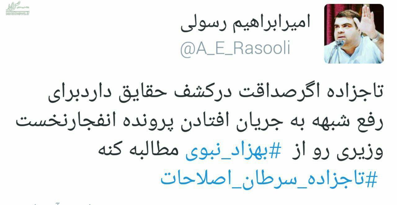 امیر ابراهیم رسولی فعال رسانه‌ای در توییتی خطاب به مصطفی تاجزاده نوشت: